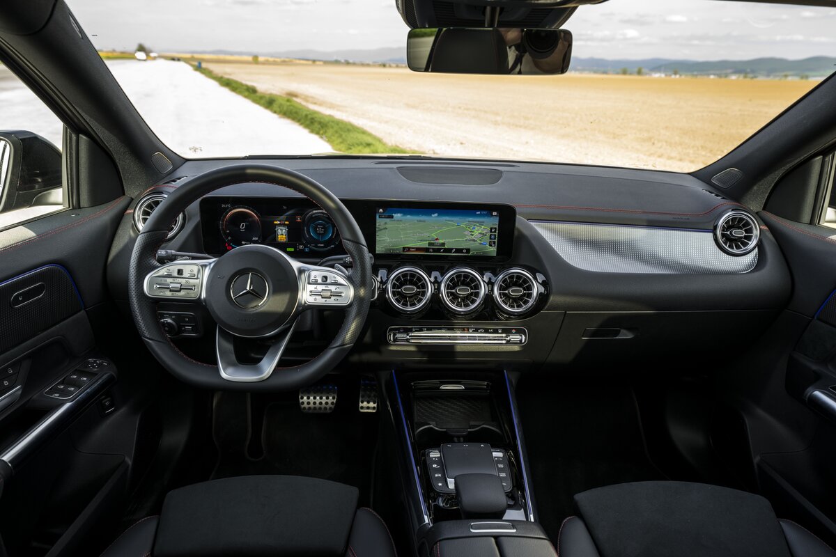 Modernizovaný systém MBUX , zahŕňa inteligentný systém plánovania trasy, zohľadňujúci doby nabíjania a na základe nepretržitých simulácií dosahu s prihliadnutím na topografiu, počasie, hustotu premávky a jazdný štýl priebežne vypočítava prestávky na nabíjanie vrátane potrebného času nabíjania. V praxi to vypadá tak, že keď si naplánujete trasu, okrem vzdialenosti a času dojazdu sa vám zobrazí aj predpokladaný zbytok kapacity batérie v % SOC. Ak plánujete na trase viacero prejazdných bodov, zobrazí sa úroveň batérie v každom z nich. Navigácia má tiež funkciu rozšírenej reality ktorá pri príjazde k odbočke zobrazuje navigačné značky v živom obraze z prednej kamery. Systém naviac dokáže pracovať s navigačnou databázou, snímačom sklonu a prednou kamerou z ktorých preberá dáta pre ovládanie inteligentnej rekuperácie, takže ak dáte nohu z plynu, sám rozhoduje či je výhodnejšie plachtiť alebo zaradiť rekuperáciu a spomaliť tak. Z ďalšej technologickej výbavy tu nájdete systém autonómneho brzdenia, na zamedzenie kolízie alebo zmiernenie jej následkov. Systém je schopný zabrzdiť pred stojacimi vozidlami a prechádzajúcimi chodcami pri typických mestských rýchlostiach. Balík Driving Assistance Package zabezpečuje funkcie odbočovacieho manévru, núdzového koridoru, varovania pri cúvaní a varovanie, keď sú v blízkosti priechodov pre chodcov detegovaní chodci. Celková spotreba sa po 1200 km ustálila na 19,3 kWh/100 km, pričom 40% jázd tvorila diaľnica.