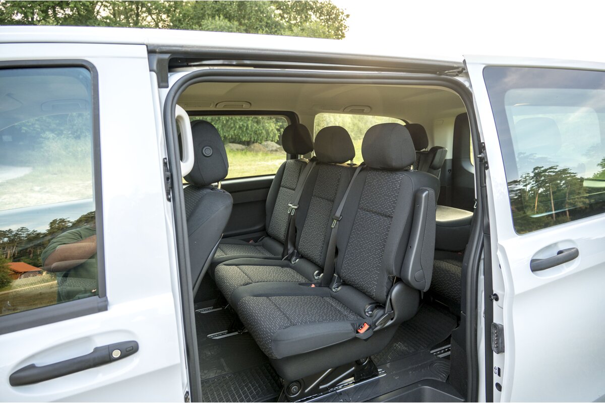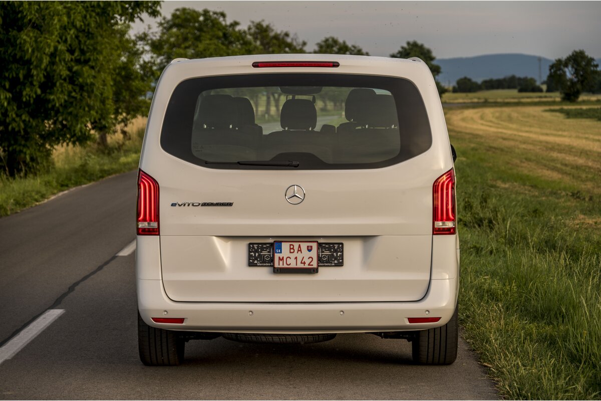 eVito Tourer je predovšetkým veľkopriestorový elektromobil na pohodlnú prepravu osôb. Nastupovanie cestujúcich uľahčujú dvoje posuvné dvere po oboch stranách, a veľké zadné dvere vyklápané nahor. Nabíjací konektor CCS Combo je umiestnený veľmi prakticky v ľavom prednom rohu.
