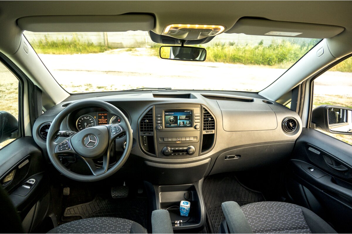 eVito je vybavený jednoduchým multimediálnym systémom s 8,5” dotykovým displejom s vysokým rozlíšením okolo ktorého sú rozmiestnené mechanické tlačidlá pre prechod k hlavným funkciám. Systém cez kábel podporuje zrkadlenie mobilu cez Android Auto a AppleCar Play. Prístrojový panel je tvorený dvojicou ručičkových ukazovateľov rýchlosti a výkonu. V nich sú vnorené ďalšie dva ručičkové ukazatele, stav nabitia batérie a dostupný výkon. V strede prístrojového panela je umiestnený monochromatický LCD displej zobrazujúci údaje palubného počítača a ďalších systémov. Technologická výbava je chudobnejšia, avšak nechýbajú bezpečnostné systémy pre detekciu prekážok a chodcov s automatickým brzdením aj príplatkový adaptívny tempomat Distronic. Osvetlenie je plne pod taktovkou LED technológie vrátane adaptívnych svetlometov s plnou automatikou.
